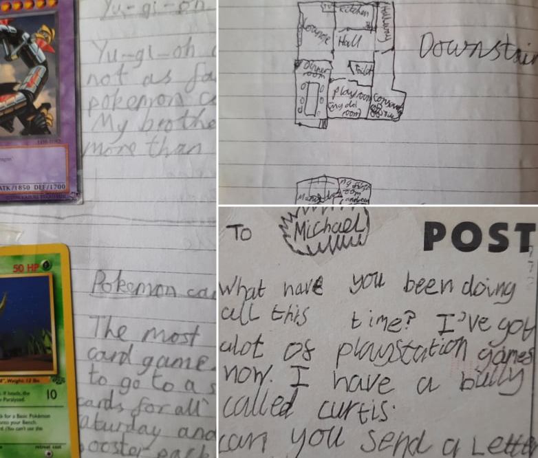It’s obvious reading through these scrapbooks that I assumed I would forget a great deal later in life. Just as I did with my friends, I wrote a list of my family members, with their relation to me next to their names. For example, “Frank: little brother”. I taped family photos too; me as a baby sat on my father’s lap, me crawling across the floor of Mama Mia’s (a long since closed Italian restaurant in Bristol owned by family friends), me and my brother dressed up as Robin Hood characters, et cetera. I made a profile of myself, detailing everything from my eye color to my favorite meal. Perhaps most interestingly, I drew a map of the house I lived in until the age of 8, which was intricately detailed and annotated so that I could provide the clearest, fullest account of its existence as possible. I taped a Pokémon card and a Yu Gi Oh card and wrote, as if for a historical encyclopedia, “These were popular card games many of us played at school. On weekends my brother and I would buy booster packs with our pocket money at a shop called Cards for All.”