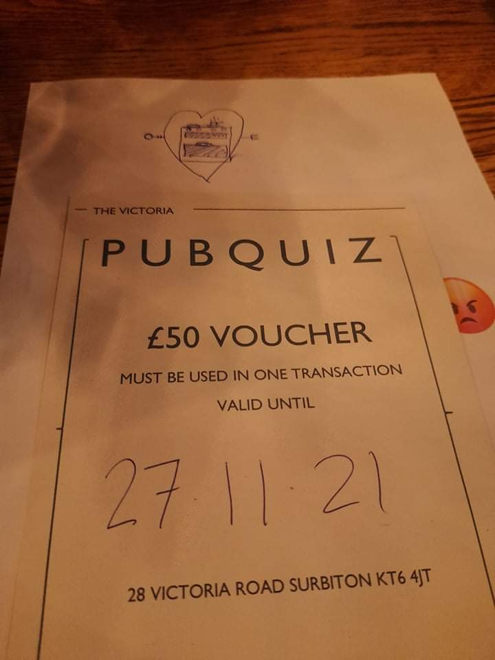 Between rounds, my friend started drawing an official logo for our team: an oven inside a heart, pierced by a horizontal fork that spelled O and E either side. Given that Halloween was only a few days away, all the questions were themed around it, including a fun round on mythological creatures that we did particularly well in (featuring answers such as Banshee, Will o’ the Wisp, Baba Yaga, and Wendigo). There was a picture round where we were given a sheet displaying 6 horror movie villains that we had to name, as well as a music round, which was composed mainly of songs the host considered “spooky” in some way. Last came The Wipeout Round, which I think is the pièce de résistance of The Victoria pub quiz. There are six questions, and you need to get them all correct to get any points, meaning you either get zero or six. The swing that comes with getting all six points can make all the difference as to which team wins, and bring you back if you’re trailing. On top of that, the last letter of each answer is the same as the first letter of the next answer, which I think makes it a lot of fun. For example, if you miss a couple initially, as we did, you can sorta reverse-engineer it on the basis of the other answers.