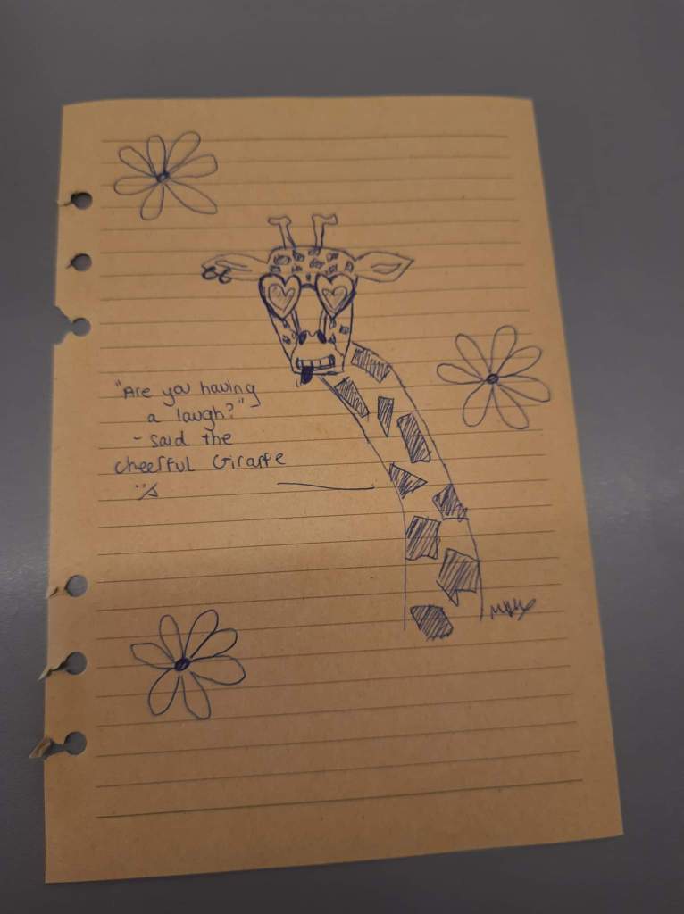 A writer from Seattle, who arrived at KU by way of working as a photographer at Disneyland- and who took the author photos for my book on the rooftop of the Town House. A trilingual Icelandic poet whose knuckles had cracked the soft jaws of toxic males, whose crystals told you your fate, and who bore a striking resemblance to the Valkyrie from The Northman. A fellow Creative Writing graduate (and fellow Mass Effect fan!) from the University of Winchester, who was actually taught by someone who graduated with me who went on to become a professor there. A fantasy writer and fellow Swiftie from Dallas who spoke longingly of Texas barbecue and made us laugh with her quick wit during a blurb workshop. A Guinness-chugging, Shania-Twain-stanning, belly-chain-wearing publishing prodigy from Montreal, who pulled us all into the orbit of her unique charisma. A goofy English Lit grad from the University of Birmingham, who trusted me to read her writing and who drew me doodles during our study sessions together in the library (see below). A guy who made music and wrote graphic novels, who I bonded with over our shared sense of humor and love of The Sopranos. A writer from Sofia by way of Swansea, who charmed me with her chaos and her tales of Bulgarian culture. A dozen more, from illustrators to bookstagrammers and translators to composers, from Italy to Norway and Romania to India.