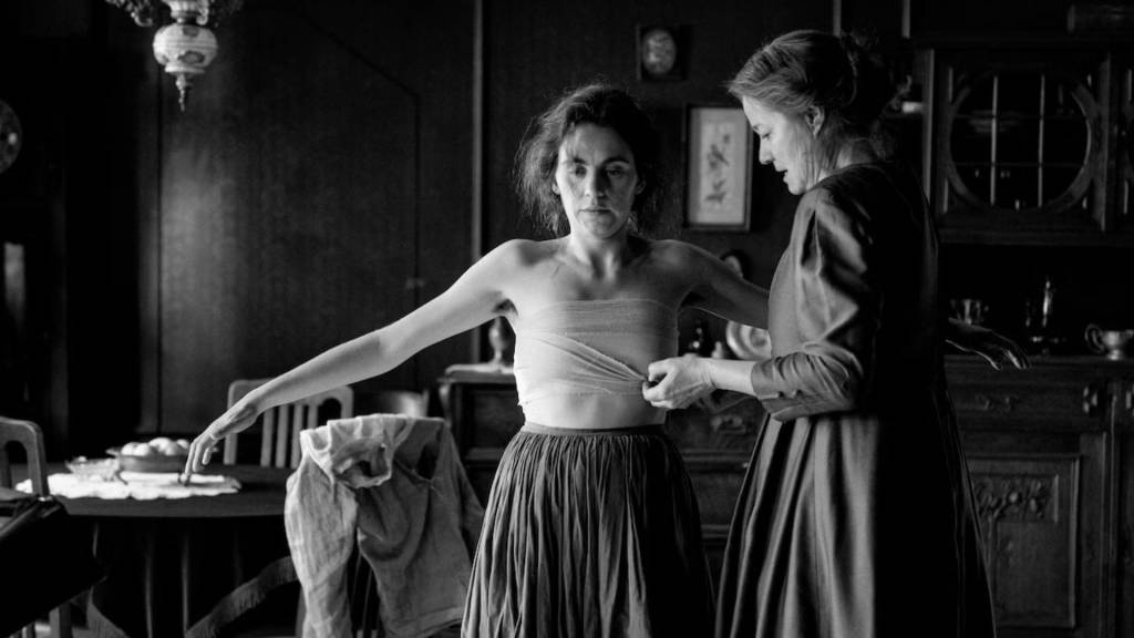 I don’t want to say too much about the plot, because this is one of those films that you’ll enjoy more the less you know going into it. In a nutshell, it’s about a young woman named Karoline living in Copenhagen in 1919. The eponymous girl with the needle (she works as a seamstress in a factory), Karoline is struggling to make ends meet; her husband went off to fight in WW1 but hasn’t come back. Nor has he written her. Since he hasn’t been legally declared dead, Karoline is unable to apply for widow’s compensation and the salary she gets from the factory isn’t enough to pay the rent. The film opens with her losing the apartment she once shared with her husband and having to live in squalor. How she navigates this—particularly in the context of being a woman in the early 20th century—drives the events of the plot.